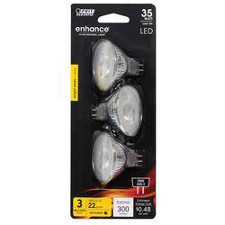 Enjoy all the benefits of advanced LED energy-saving technology with the Feit Electric BPFMW/930CA/3 35 W FMW GU5.3 MR16 LED light bulb. These 3000K bright white bulbs are dimmable and will replace a 35 W equivalent incandescent bulb. It produces a similar light output (300 Lumens) but only uses 4 W of electricity. Get instant on to full brightness with relatively cool running performance. This Feit Electric MR16 bulb has an average life of 25,000 hrs is RoHS compliant and 100% mercury-free. Choose a dependable 12 V MR16 track and recessed lighting bulb for residential or commercial applications.