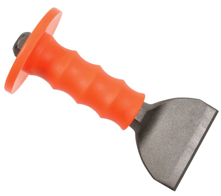 Hand guarded mason chisels are used in many masonry applications including cutting, sizing, and scoring brick, stone and concrete. A hard plastic, ergonomic handle allows the user to firmly grip the tool for precision, comfort and shock absorbance. Many sizes are available for the perfect application. A shot- blasted finish is added for durability. Made in the USA.