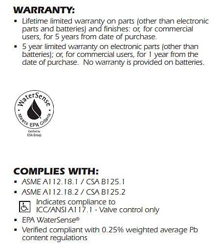 | Certification, Codes, Standards | ASME A112.18.1/CSA B125.1; ASME A112.18.2/CSA B125.2; EPA WaterSense®; ICC/ANSI A117.1 - Valve Control Only |