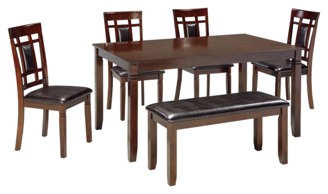 Set the scene for ultra-contemporary style with this dining room table set. Tables rich, dark finish and clean, gently tapered profile is the epitome of great taste. Cutout-design chairs with upholstered seats and back supports are a cut above. Addition of upholstered bench incorporates a generous helping of casually cool flair.