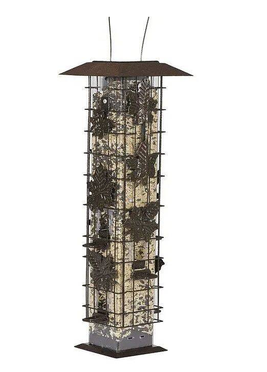 The Perky-Pet® Squirrel-Be-Gone® Bird Feeder combines innovative squirrel-resistant features with attractive design to create a feeding station that is truly unparalleled. The weight-activated cage keeps squirrels from accessing ports, while the metal helps to resist damage from chewing. With its rustic powder coating and decorative leaf-themed design, this feeder will make a charming addition in any backyard setting. Simply hang using the convenient built-in hanging cord!