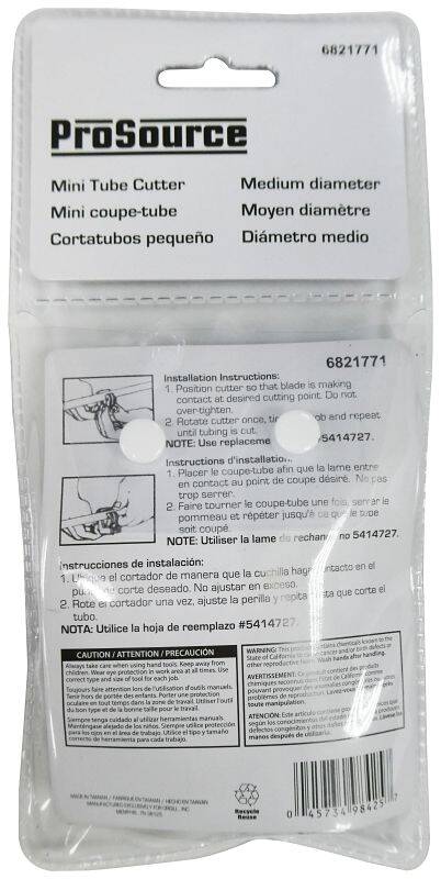 This ProSource mini tubing cutters cutting capacity is 1/8 to 7/8 in OD. The body is made zinc with a steel knob and the color is silver.