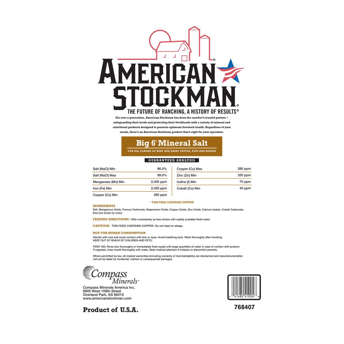 American Stockman® Big 6® trace mineralized salt is one of our most popular products. With the six core micro-minerals required for animal health — cobalt, copper, iodine, iron, manganese and zinc — it’s the first choice for weight gain, feeding efficiencies and overall herd performance. For all classes of beef and dairy cattle, pigs and horses.