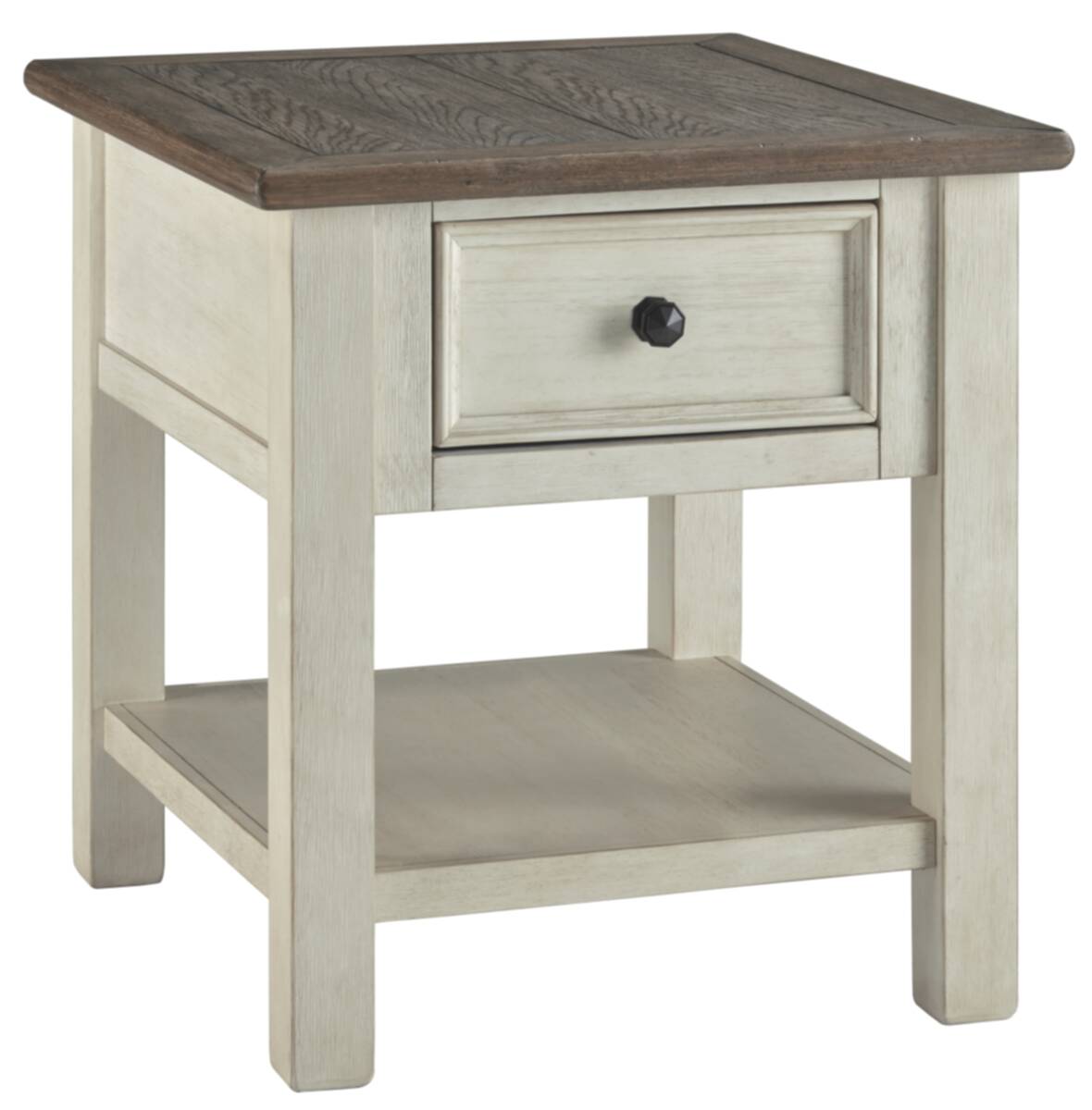 Whether your style is farmhouse fresh, shabby chic or country cottage, youll find this end table dressed to impress. Its two-tone, gently distressed finish pairs weathered oak with antique white for that much more quaint character. Charming elements include a plank-and-frame style top, black faceted hardware and a smooth-gliding drawer for remote controls and more.