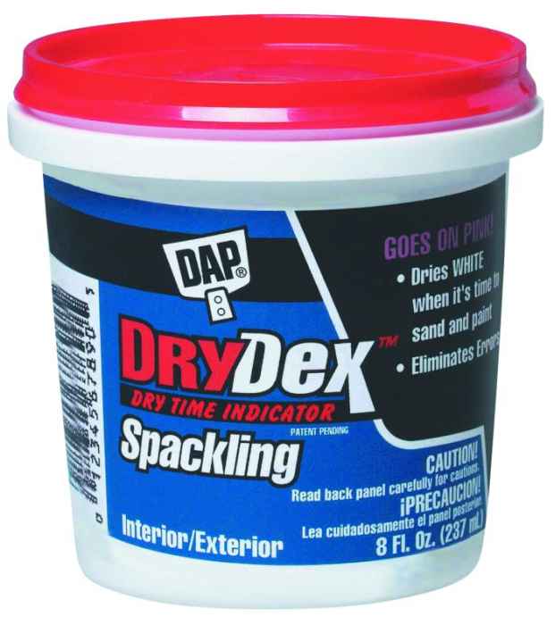 DAP® DryDex® spackling provides a unique dry time color indicator that verifies when the patched surface is dry and ready-to be sanded and painted, thus providing a smoother finished surface in a shortened amount of time. DAP® DryDex® spackling may be used to fill holes and cracks in surfaces such as drywall, plaster, wood, brick and stone. Its ready-to-use formula spreads easily for fast, professional repairs that will not crack, crumble or flake. DryDex® dries hard, sands easily and can be painted.
