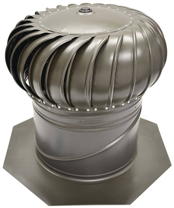 Permanently lubricated track system, upper and lower stainless steel ball bearings prevents metal-to-metal contact, encased to help prevent dirt, dust, sand and other foreign materials from damaging bearings for long life, less friction, smoother spin and wear resistance. Heavy-duty steel spider braces and case-hardened steel shaft for long-lasting strength/durability. Simple, mechanically-locked, two-piece head/base for faster, easier installation. Pre-punched bottom/crimped collar of one-piece base fits tighter, makes installation easier and allows for adjustability up to 12/12 pitch without removing turbine. Extra-large flashing and head with included bottom ring for easier installation and better weather protection. Double ribbed vanes, with convex top, direct even wind-driven rain away from the unit. Dade County/Texas Department of Insurance approved.