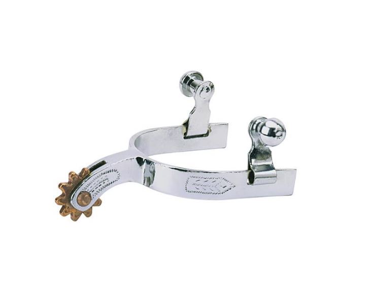 These chrome plated spurs have a 1-1/4 in shank, a 1/2 in band and a 10 point rowel. Children's size.