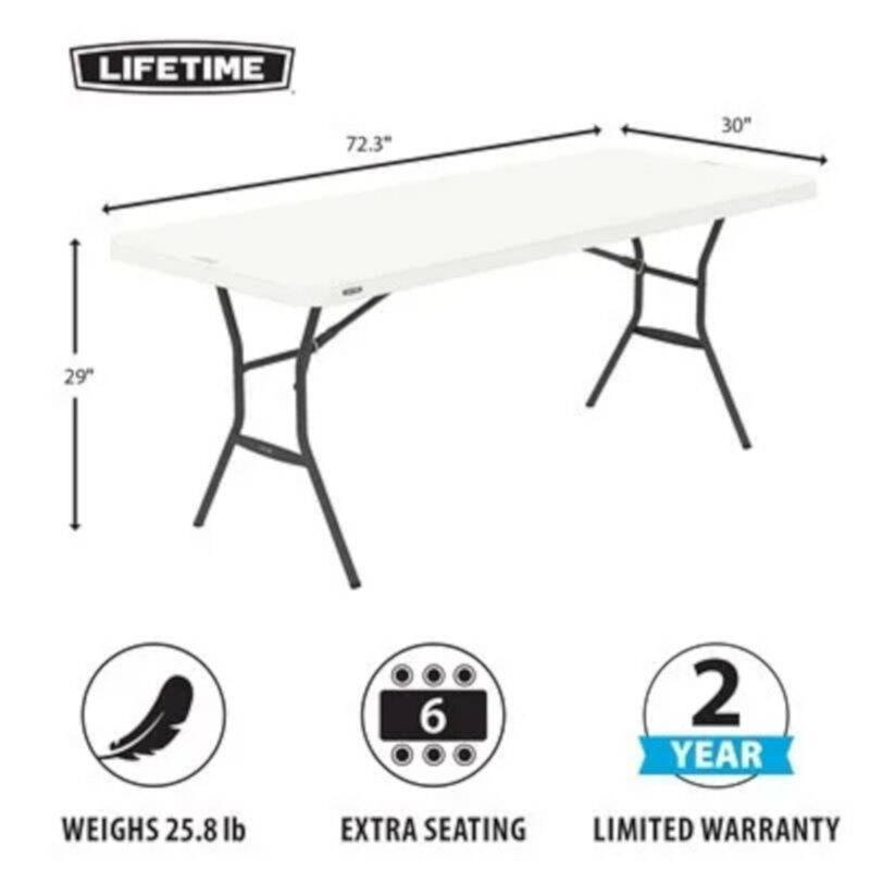 Lifetime 6-Foot Light Commercial Folding Tables are constructed of high-density polyethylene and powder-coated steel. The convenient, lightweight design makes it easy for anyone to set up and take down. Our tables are UV-protected, will not crack, chip or peel, and are built for indoor and outdoor use. The patented steel frame design provides a sturdy foundation and is protected with a powder-coated, weather-resistant finish. Perfect for home or office use, Lifetime’s Folding Tables are ideal for your next meeting, dinner or family gathering.