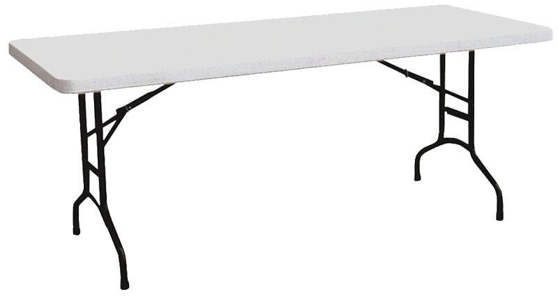 With this multi-utility banquet table you can be rest assured that you will have enough surface space for any function and take the stress out of hosting your next gathering. This rectangular bi-fold folding table is 6 feet long and is beneficial in a multitude of settings that include banquet halls, conference centers, cafeterias, schools and in the home. Use as a temporary seating solution or setup for everyday use. This plastic folding table comfortably seats up to eight adults while ensuring plenty of legroom. Speed up the time it takes to set-up and tear-down wedding receptions, graduation parties, banquets, buffets and other events with this folding table. Whether you're hosting an indoor or outdoor gathering, the smooth design is easy to wipe clean. When using for outdoor events store indoors to protect the frame from extreme moisture. The table legs fold under for storage while the attached carrying handle provides better portability. This table is commercial grade to withstand everyday use in the hospitality industry.