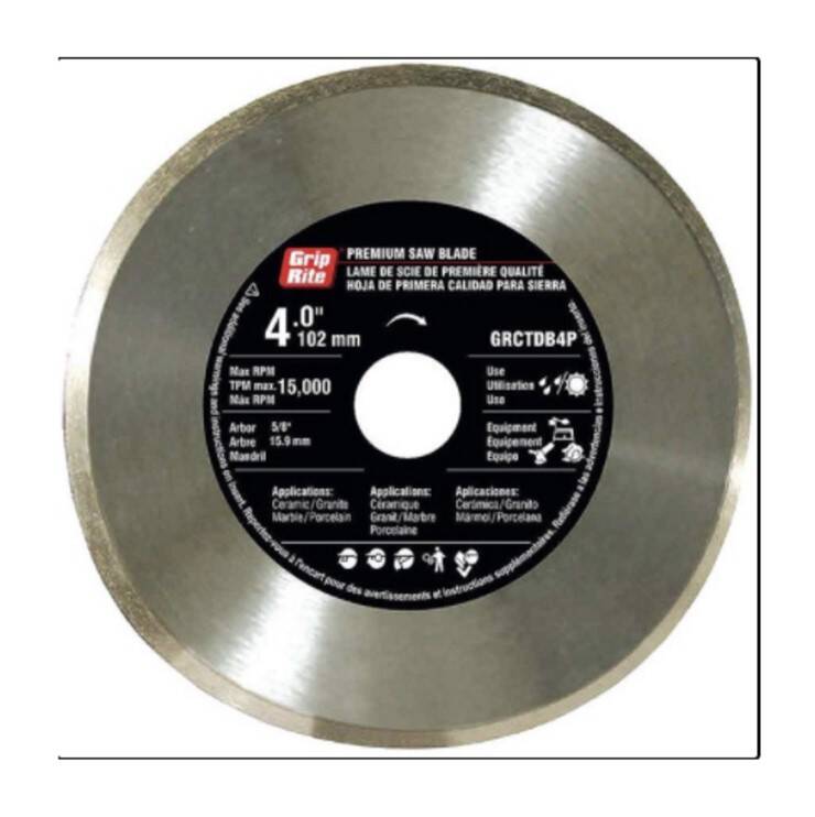 Grip-Rite® PREMIUM QUALITY CONTINUOUS RIM TILE DIAMOND BLADE offers fast cutting with excellent blade life. The continuous rim allows for smooth chip-free cuts on marble and tile. This blade is designed for wet or dry cutting on Granite, Porcelain, Ceramic, and Marble applications.