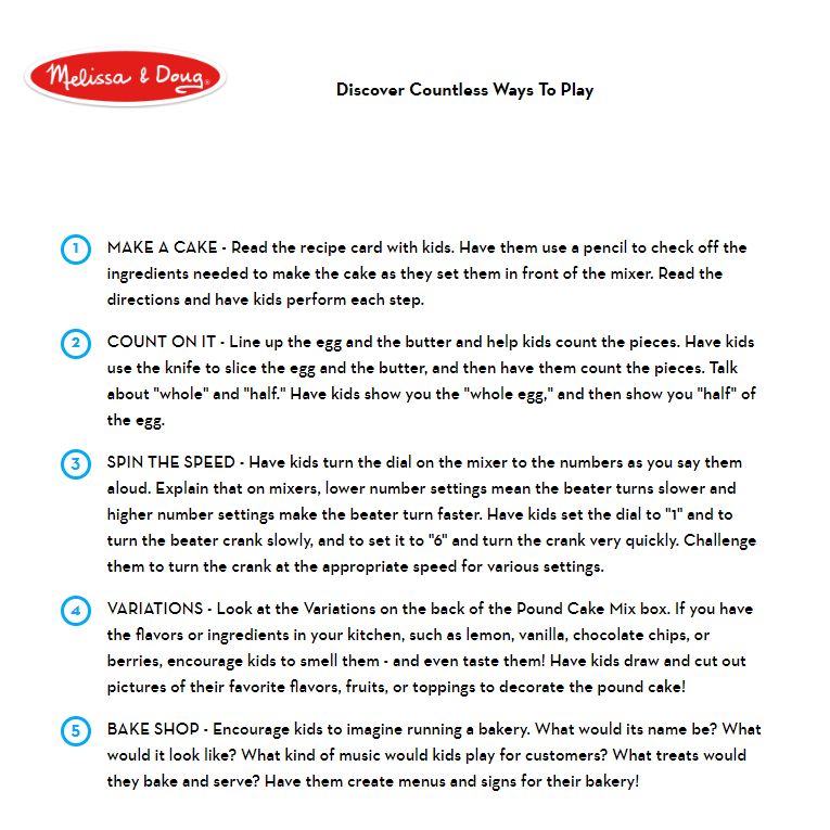 | Includes | Mixer, bowl, sliceable wooden egg and butter, loaf, cake pan, pretend cake mix box, cake pan, wooden knife, recipe card |