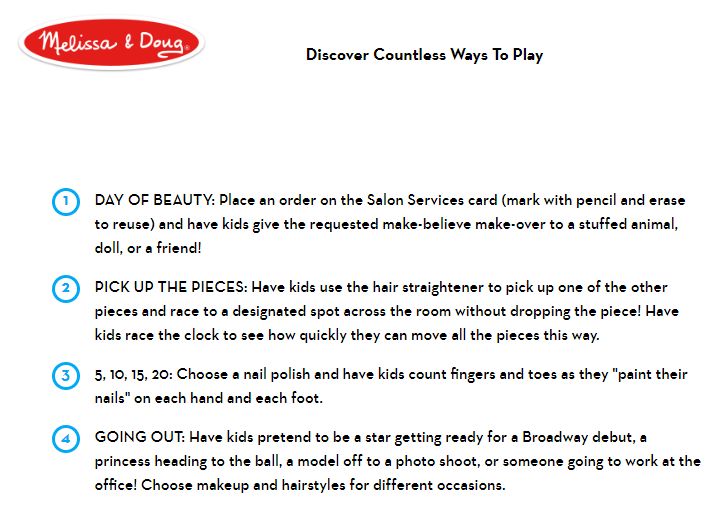- 18-piece wooden beauty salon makeup, hair, and nails pretend play set