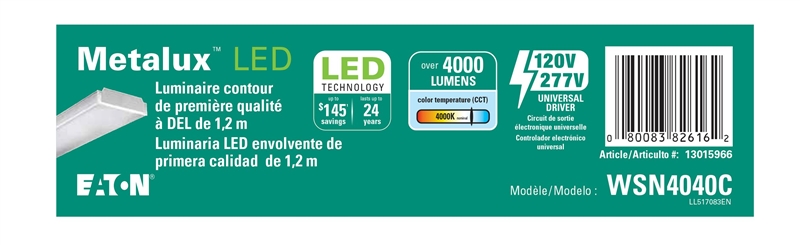 Cooper Controls Wraparound Light, Wattage Rating: 21 to 40 W, Number of Lamps: 2, Lamp Type: LED, Beam Type: Narrow, Lumens: 4000, Fixture Material: Steel, Fixture Color: White, Dimensions: 2.8 in H x 9.4 in W x 50.25 in D, Ceiling, Wall Mounting