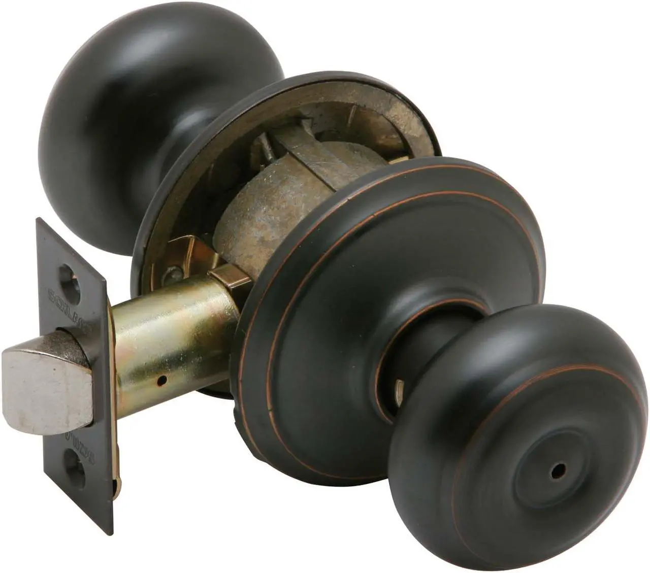 The Aged Bronze Georgian Privacy Knob is a stylish, easy-to-use privacy lock ideal for bedrooms and bathrooms where simple, reliable privacy is needed. Finished in warm aged bronze, it coordinates with plumbing and lighting finishes while bringing a classic Georgian look to interior doors. Installation is straightforward—an easy three-step process that requires only a screwdriver and supports one-tool, one-person setup. The knob includes a triple-option latch with an adjustable backset to fit either 2-3/8-inch or 2-3/4-inch spacing and is built to fit doors 1-3/8 to 1-3/4 inches thick. Constructed with quality materials and solid construction, it gives dependable performance and a secure feel for everyday use, whether updating a guest room, outfitting a hallway bathroom, or refreshing interior door hardware throughout the home.
