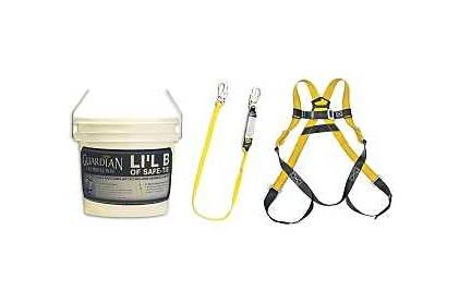 The Lil' bucket of safe-tie is a roofing kit built for the roofer, by the roofer. The Lil' bucket of safe-tie comes with one HUV harness (different size options are available), one 6 ft single leg lanyard with shock pack and one nylon bag for equipment transportation and storage.