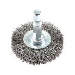 Stem-mounted 1-1/2 in 'fine' wire wheel brush with 1/4 in hex shank. Designed for easy access into narrow holes and confined areas. Crimped style for light to medium duty applications. Removes rust, scale and paint in hard to reach areas. Use with any 1/4 in Dia electric power drills or 01990 pneumatic (air) drill.