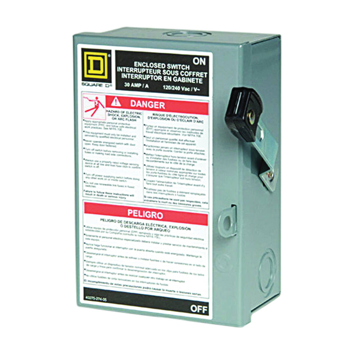 Single phase, 2 pole, 3 wire (2 blades, fuseholders and 1 neutral), 120/240 volt AC. Rated 3 HP at 240 volt AC, with metallic enclosure. 10,000 AIC (short circuit rating) with class H cartridge fuses. NEMA type 1 enclosure. Terminal lug data: (1) #12 - 6Al or #14 - 6 Cu. wire. Service ground bar kit PKGTA1 sold separately. Padlock attachment for lock off. UL Listed, meets NEMA standard KS1.