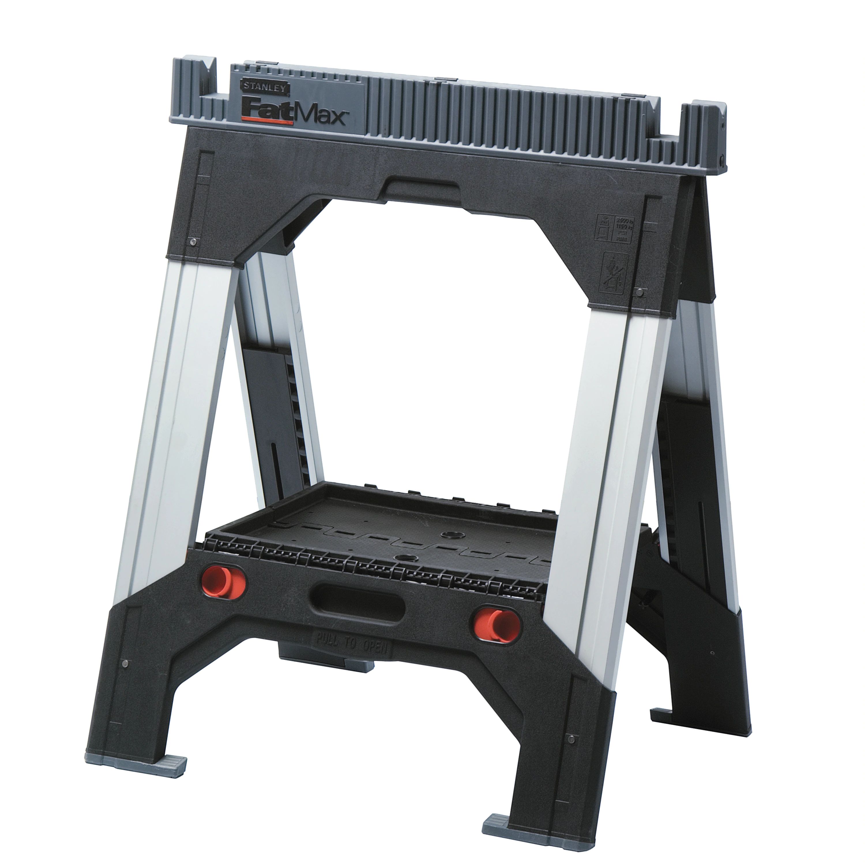The STANLEY® FATMAXAdjustable Leg Sawhorse allows for the legs to be adjusted separately, enabling the sawhorse to stand on uneven surfaces. This solid sawhorse is made from high-quality, sturdy polypropylene and steel and has rubber inserts for added stability. Its unique slide mechanism provides for easy, smooth adjustment.