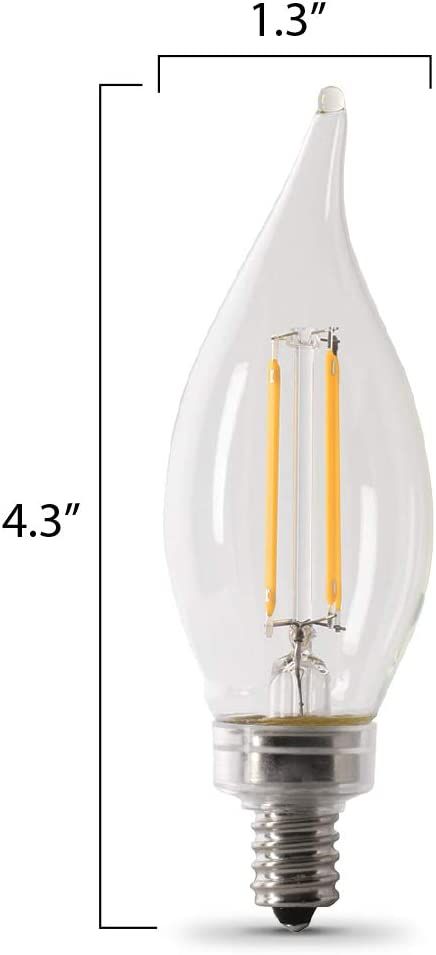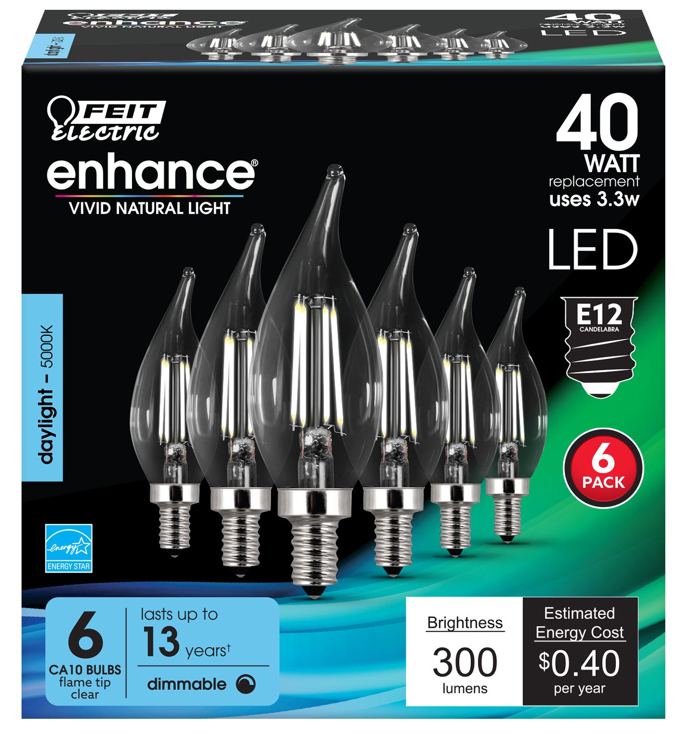 Enjoy all the benefits of advanced LED energy-saving technology with the Feit Electric CFC40/950CA/FIL/6 high-CRI dimmable chandelier LED light bulb. Replacing a 40W incandescent light, it produces 300 lumens of 5000K natural daylight illumination while using only 3.3 watts of electricity - saving up to 91% in energy costs. A stylish flame-tip design with exposed filament instantly livens up the dcor of any room. A 90+ CRI makes colors vibrant and skin tones look more natural, all while saving energy and lasting for a decade or more. These LED bulbs have an average life of 15,000 hours / 13 years, are RoHS compliant and 100% mercury free. Choose a dependable decorative bulb to brighten your home.