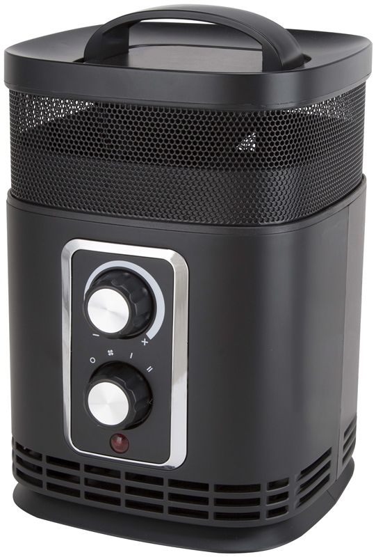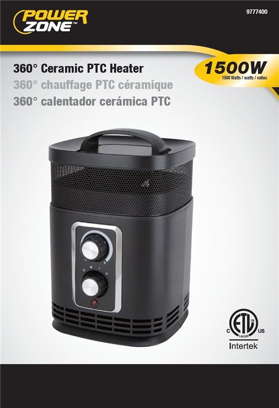 Ceramic heater has 750/1500W heat settings. Adjustable thermostat. Safety over heating protection. Safety tip-over switch. 360-degree heating range. Energy-efficient PTC technology. Plastic construction. ETL/CETL listed. Size: 11 in H x 7-1/4 in W x 7-1/4 in D.