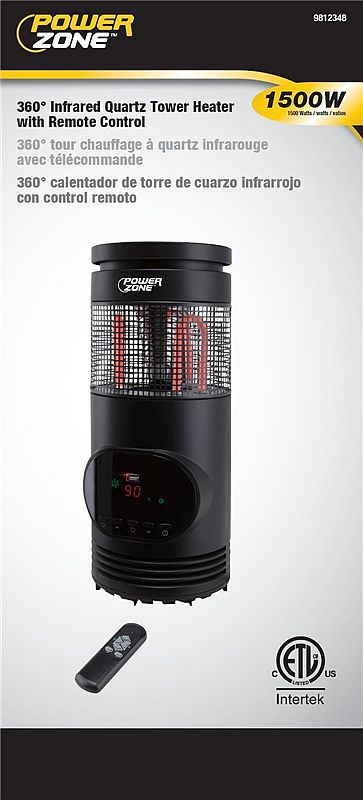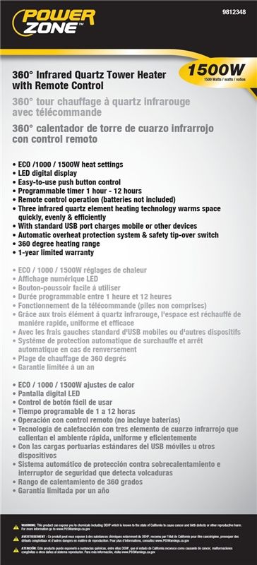 360 deg Infrared quartz tower heater with remote control and LED digital display with easy-to-use pushbutton control. ECO/1000/1500 W heat settings. Programmable timer 1 to 12 hr three infrared quartz heating elements. Standard USB port charges mobile or other devices. Automatic overheat protection system and safety tip-over switch.