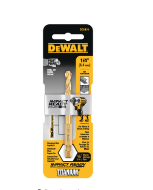 Constructed from one solid piece of heavy-duty metal, DeWALT® IMPACT READY® Titanium Drill Bits are up to 5 times more durable than 2-piece conventional bits. A patented web taper helps to increase bit strength, and a patented Pilot Point® Tip delivers speed and clear, burr-free holes with helps to reduced bit walking. Ideal for metal, wood, and plastic.
