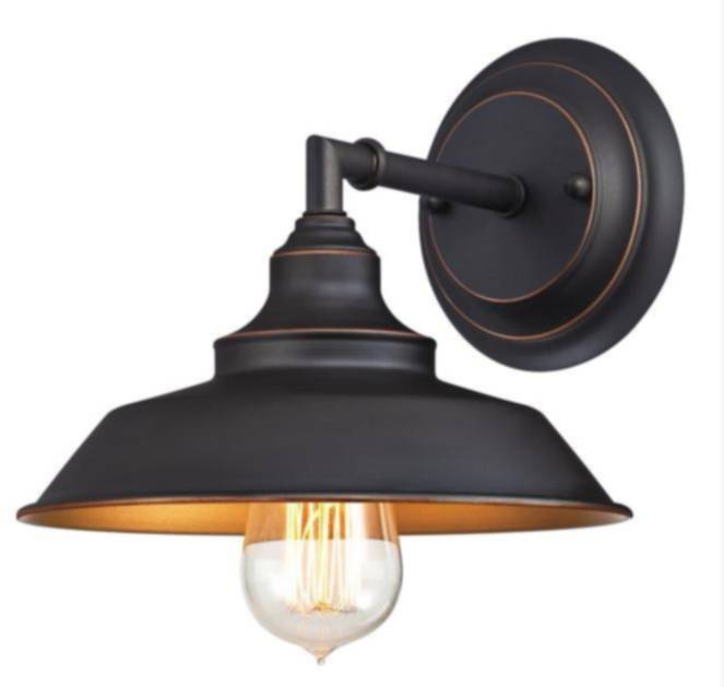 The industrial, vintage design of the Iron Hill one-light wall fixture is perfect for a multitude of interior styles, from modern living spaces to farmhouse kitchens. Oil rubbed bronze finish with highlights on a broad shade creates a rustic farmhouse appeal. Enhanced by a metallic bronze finish, the interior of the metal shade casts a warm glow. Install in a bathroom, over a vanity or in pairs to add a touch of rustic charm and provides generous light for small spaces. For added vintage appeal use Westinghouse Timeless Vintage Inspired light bulbs (not included) to create the atmosphere you want.