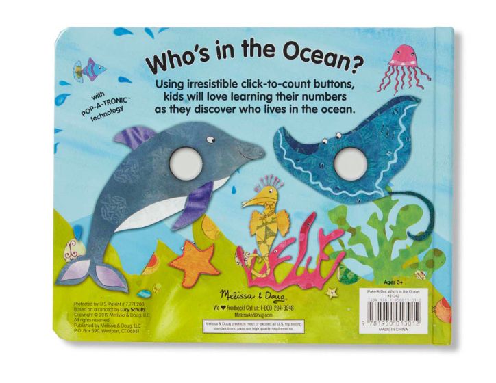 Who's in the Ocean? Pop the dots to find out! Poke the irresistible click-to-count buttons to hear satisfying "clicks" and "pops" as you count all the amazing creatures in the sea! This sturdy 20-page interactive board book invites kids to pop along as they explore the ocean and learn fun facts along the way! Poke-a-Dot® books help encourage language development, counting, and fine motor skills. Patented Pop-a-Tronic technology lets kids discover different popping sounds by poking the dots from the front or the back, with pages raised or flat!