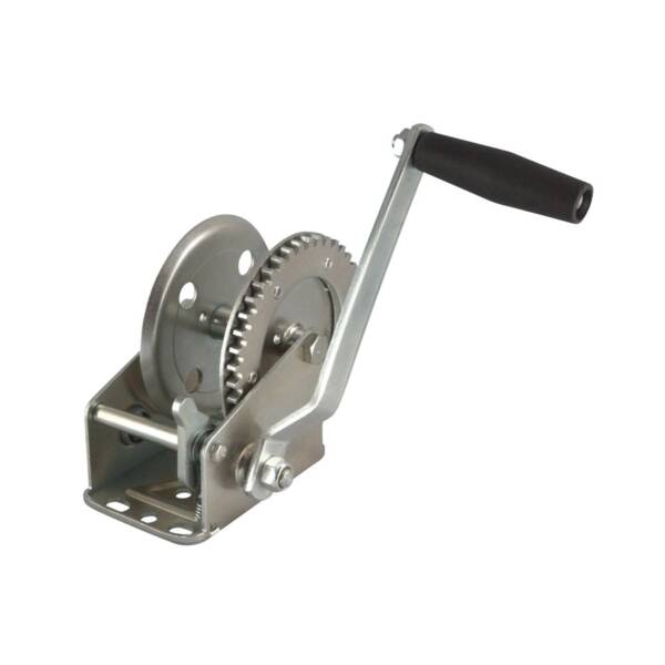 Two-speed trailer winch. 2-way ratchet type with neutral. Gear ratios, 4.1:1, 9.8:1. 20 ft x 7/16 in rope. 1800 lb capacity.