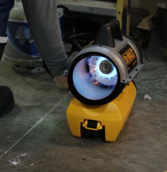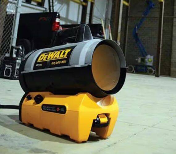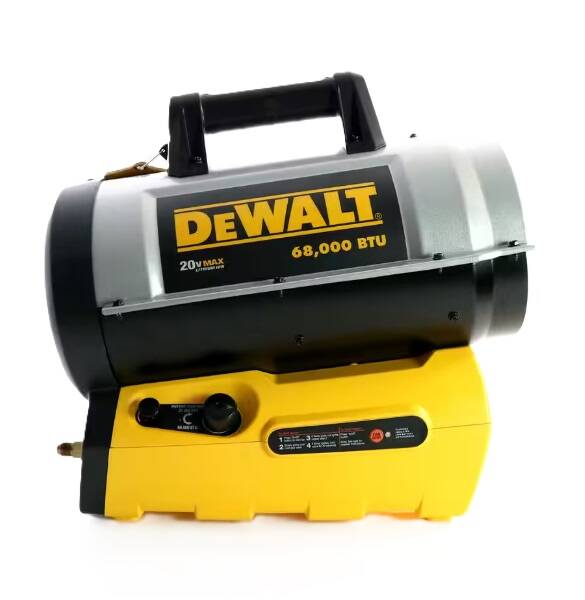 DeWalt 68,000 BTU Jobsite Cordless Forced Air Propane Heater. This heater keeps your workspace, garage, or workshop warm in the freezing cold, outputting 27,000 to 68,000 BTUs of heat per hour with the power of propane and onboard 20V battery for ignition (battery not included).