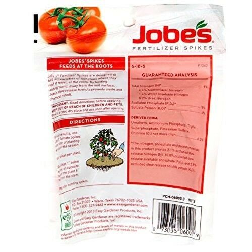 Get what everyone wants from their tomato plants healthy vigorous growth and an abundant crop with Jobes Fertilizer Spikes for Tomatoes. Convenient and easy to use, Jobes spikes provide nutrition underground at the roots, where plants can actually use it. Just insert spikes around the plants and the slow-release formula feeds your tomato plants for up to 8 weeks. Plus, spikes ensure that nutrients arent washed away like surface-applied fertilizers. The specially formulated, pre-measured spikes deliver fast, easy and mess-free fertilizer. Our tomato spikes are available in a waterproof, resealable pouch or in a cardboard blister card pack.