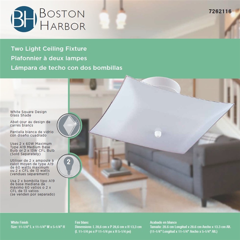 The Boston Harbor dimmable ceiling light fixture lamp wattage is 60 W and the dimensions are 11-1/4 in L x 11-1/4 in W x 5-1/4 in H.