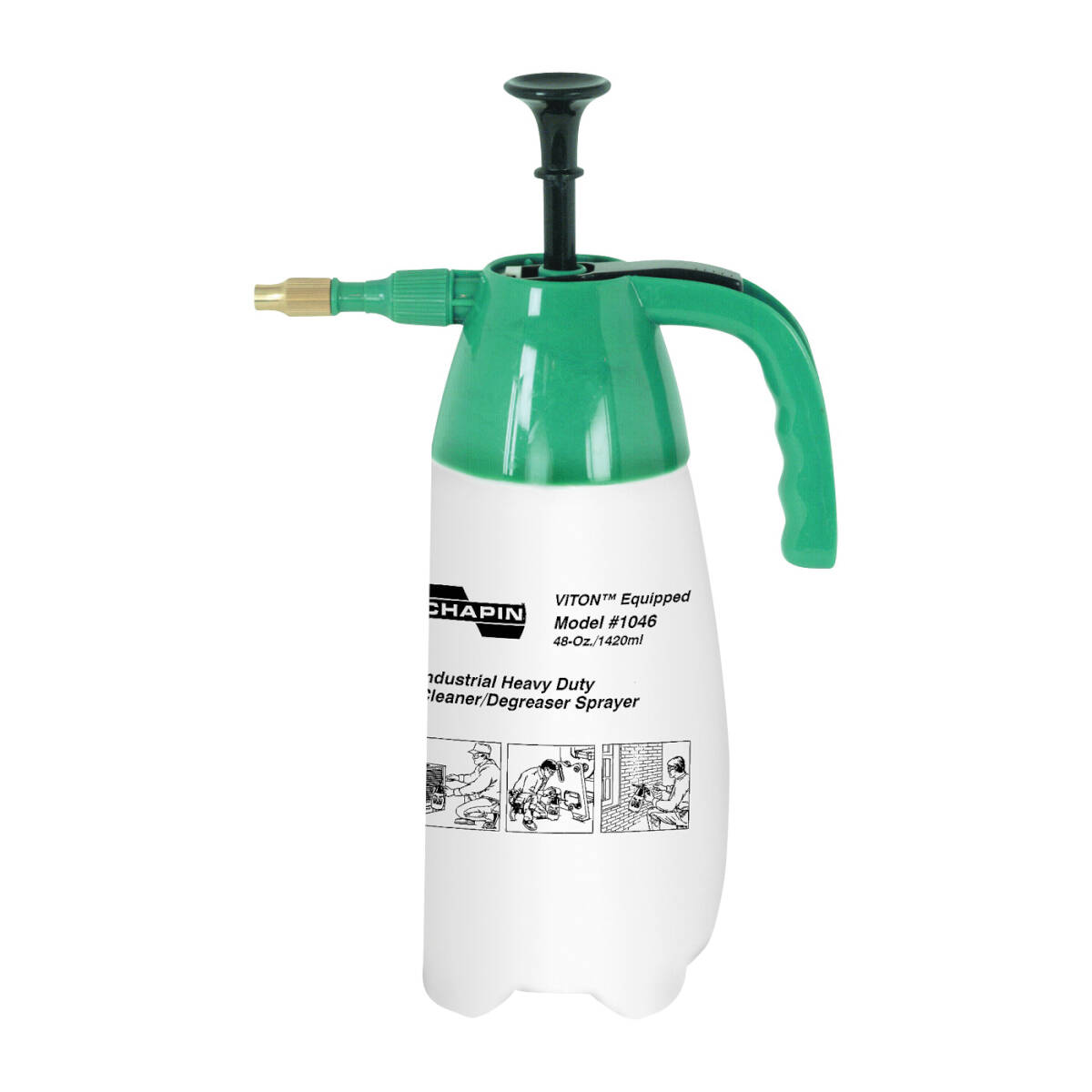 CHAPIN industrial sprayer is designed for industrial strength cleaners and degreasers. It features a 48 oz poly bottle, ergonomic handle. This sprayer has chemical-resistant seals and gaskets. An adjustable poly and brass cone nozzle allows a range of spraying, from fine mist to a coarse stream.