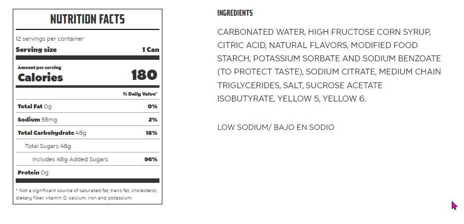 Ingredients Carbonated Water, High Fructose Corn Syrup, Citric Acid, Natural Flavors, Modified Food Starch, Potassium Sorbate and Sodium Benzoate (to Protect Taste), Sodium Citrate, Coconut Oil, Salt, Sucrose Acetate Isobutyrate, Yellow 5, Yellow 6