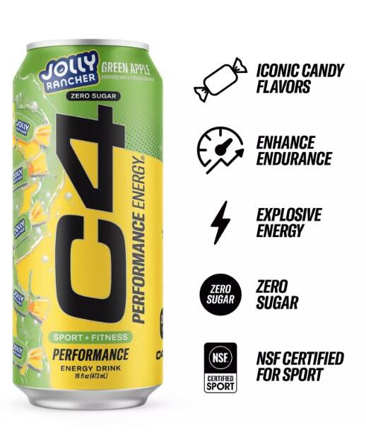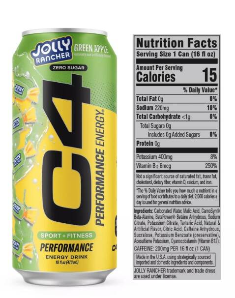 C4 Performance Energy® combines the power of the world’s #1 performance energy brand with the iconic fruity flavors of JOLLY RANCHER. With 200mg of caffeine, you'll be energized and ready to take your performance to the next level. Plus, we've included clinically studied CarnoSyn Beta-Alanine and BetaPower Betaine for refreshing hydration and enhanced endurance.