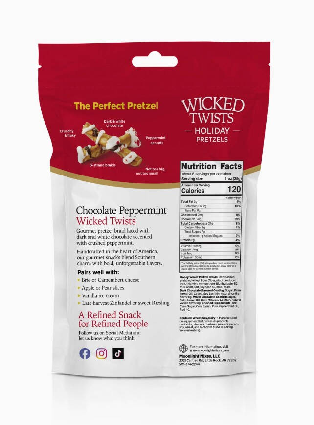 Get ready for the Wicked Twists Chocolate Pepper by Moonlight Mixes. This treat combines the richness of white and dark chocolate with a kick of crushed peppermint, all twisted around a pretzel braid. Ideal for the holiday season or to ring in the new year, this shelf-stable snack is sure to be a hit. Snack wicked, ya'll!