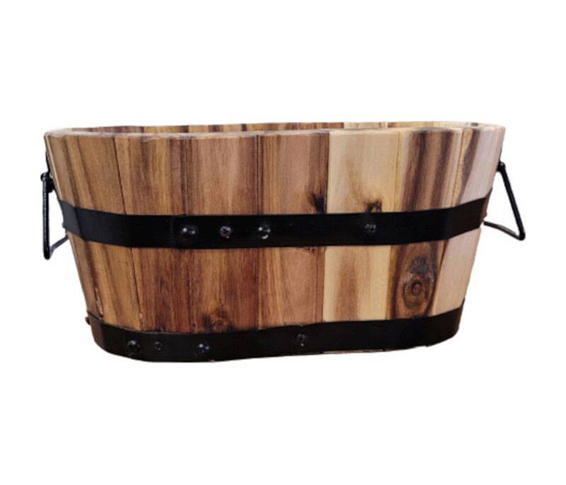 The Oval Planters are handcrafted from real wood with a light oil stain. They are naturally stylish with metal banding and handles.