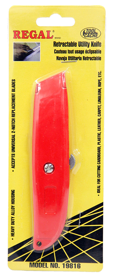 Heavy duty alloy housing. Accepts universal 2-notch replacement blades. Ideal for cutting cardboard, plastic, leather, carpet, linoleum, rope, etc.