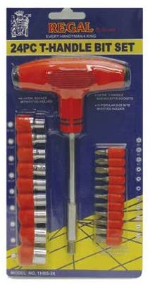 This 24-Piece T-Handle Bit Set includes 9-1/4 in drive socket with fitted holder. The 1/4 in drive T-handle bar features a comfort grip and accepts sockets. Contains the following SAE socket sizes: 3/16 in , 7/32 in , 1/4 in , 9/32 in , 5/16 in , 11/32 in , 3/8 in , 7/16 in , 1/2 in Contains the following Hex power bit sizes: #1, #2, #3, Phillips: T-10, T-15, T-20, Star: 1/8 in , 5/64 in , 3/16 in , 1/4 in , and 5/16 in slotted.