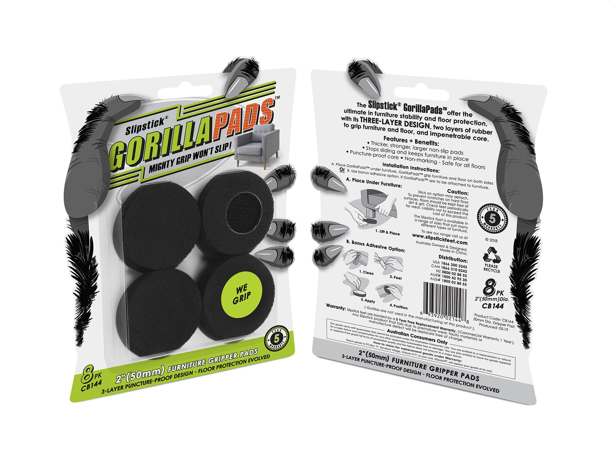 MIGHTY GRIP THAT WONT SLIP Gorilla Pad Furniture Grippers by Slip stick are the universal solution to stop unwanted movement or sliding of furniture / objects, protect hard surfaces from damage, and prevent moisture from raising up into wooden furniture feet