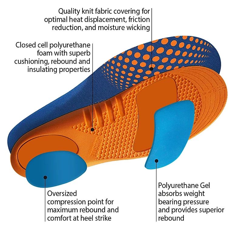Everyday comfort for all types of sport and athletic footwear. Breathable fabric wicks away moisture. Antibacterial to reduce odor-causing bacteria to help fight sweaty, stinky feet. Shock-absorbing comfort gel heel and metatarsal pad for high impact. Low arch support helps reduce fatigue. Double layer covering is lightweight and durable. One size Men and One size Ladies trim replacement insoles at toe to desired size.
