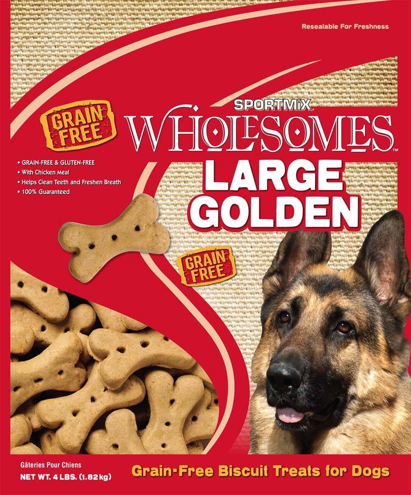 SPORTMiX Wholesomes Golden Dog Biscuit Treats are a great reward for your dog or a perfect training aid. SPORTMiX Wholesomes Golden Dog Biscuit Treats help your dogs teeth remain clean and healthy. Particles in soft foods frequently stick to the teeth of dogs. This results in tartar build-up and bad breath. The hard, crunchy texture of SPORTMiX Wholesomes Dog Biscuit Treats helps avoid this problem while satisfying the chewing needs of dogs. When used daily, these biscuit treats can help effectively remove loose food particles and tartar supporting healthy gums. SPORTMiX Wholesomes Dog Biscuit Treats are naturally preserved and 100% guaranteed for taste and nutrition. These biscuits are available in medium, large, extra large and jumbo-sized bones.
