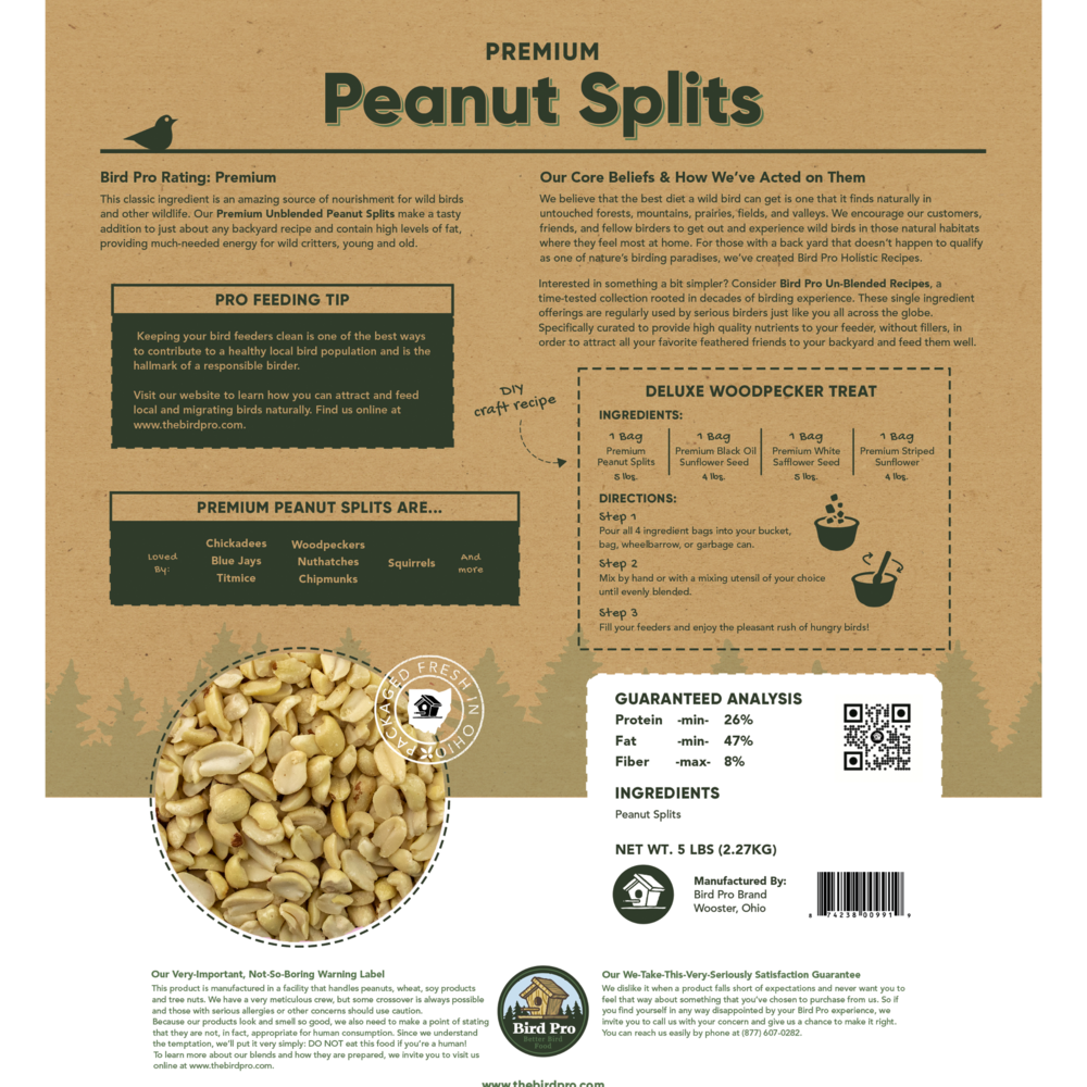 This classic ingredient is an amazing source of nourishment for wild birds and other wildlife. Our Premium Unblended Peanut Splits make a tasty addition to just about any backyard recipe and contain high levels of fat, providing much-needed energy for wild critters, young and old.