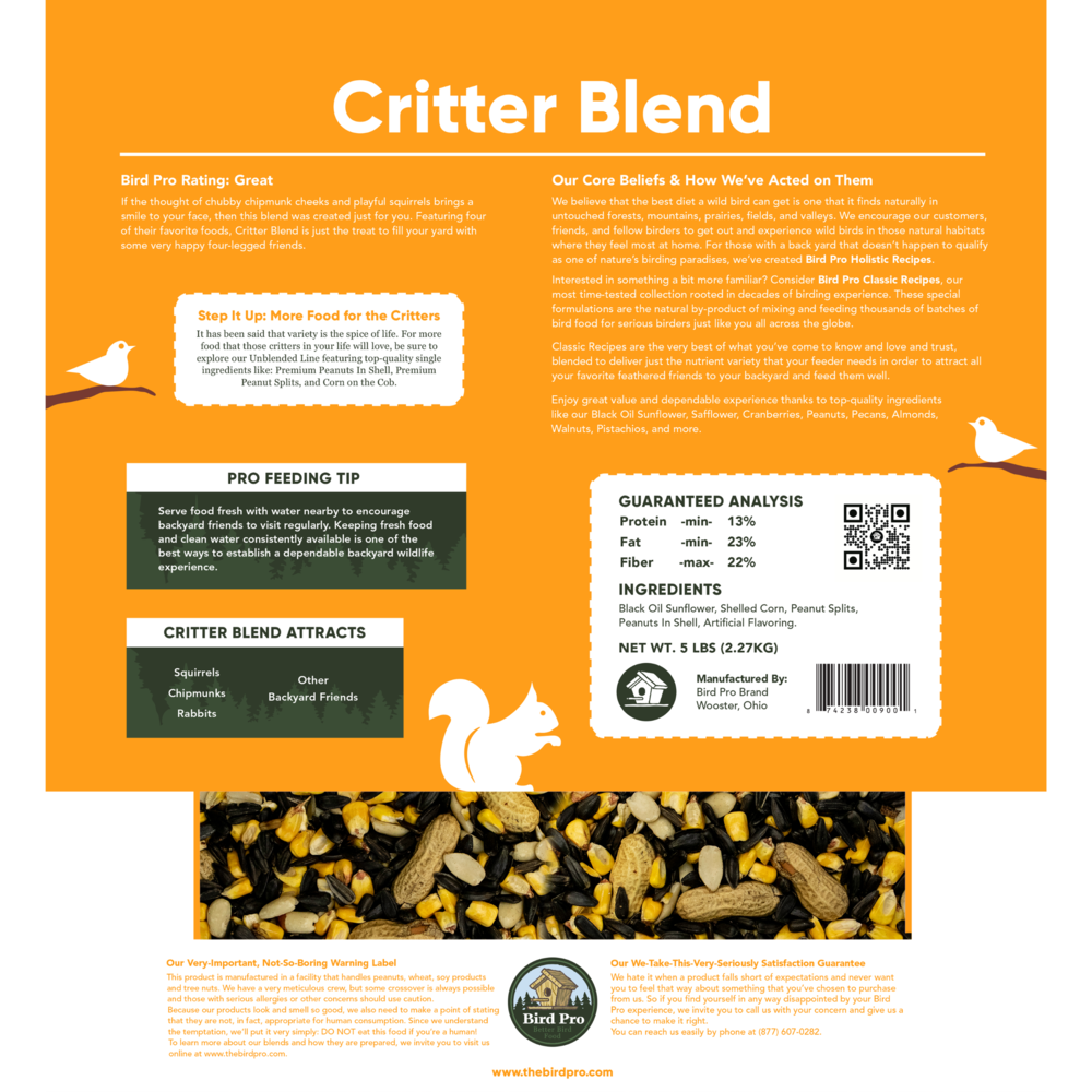 If the thought of chubby chipmunk cheeks and playful squirrels brings a smile to your face, then this blend was created just for you. Featuring four of their favorite foods, Critter Blend is just the treat to fill your yard with some very happy four-legged friends.