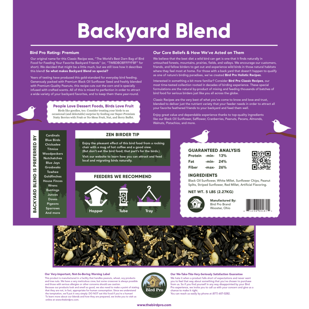 Our original name for this Classic Recipe was, The Worlds Best Darn Bag of Bird Food for Feeding Your Favorite Backyard Friends (or, TWBDBOBFFFYFBF for short). We decided that might be a little much, but we still love how it describes this blend! So what makes Backyard Blend so special? Years of testing have produced this gold-standard for everyday bird feeding. Generously packed with Premium Black Oil Sunflower Seed and freshly blended with Premium-Quality Peanuts, this recipe cuts out the corn and is specially infused with crafted scents. All of this is mixed to perfection in order to attract a wide variety of your backyard favorites, and to keep them there year-round.