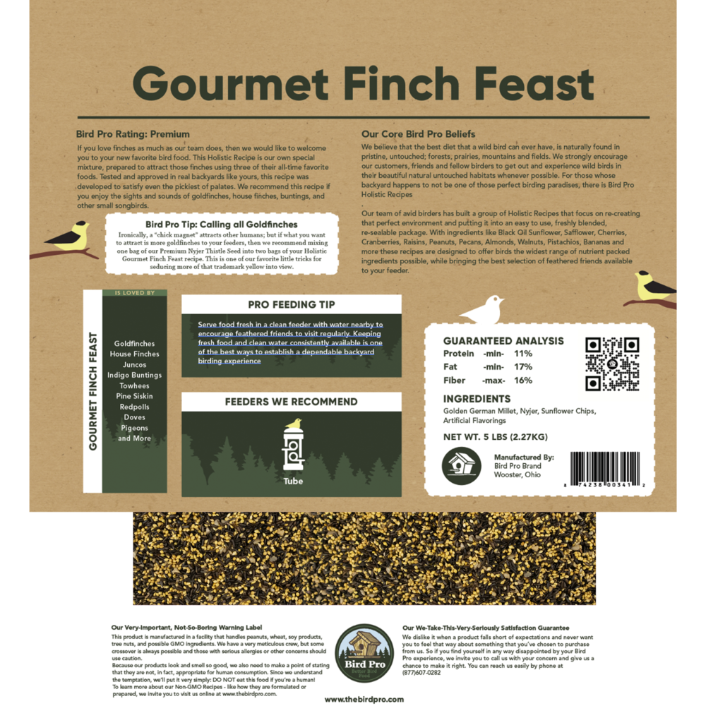 If you love finches as much as our team does, then we would like to welcome you to your new favorite bird food. This Holistic Recipe is our own special mixture, prepared to attract those finches using three of their all-time favorite foods. Tested and approved in real backyards like yours, this recipe was developed to satisfy even the pickiest of palates. We recommend this recipe if you enjoy the sights and sounds of goldfinches, house finches, buntings, and other small songbirds.