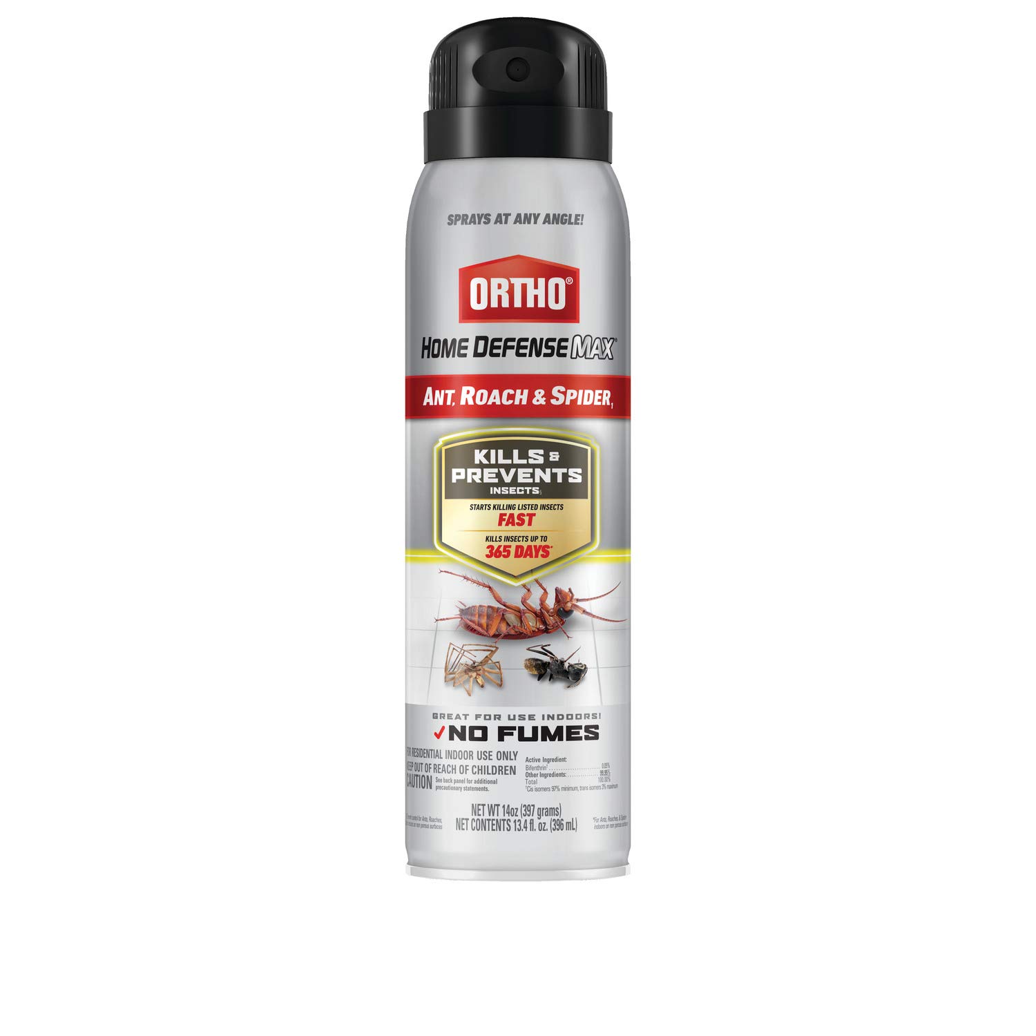 Start to kill ants, roaches, & spiders fast with with Ortho home defense Max Ant, Roach & Spider1 spray. The spray produces no fumes, just results. The sprayer works when used at any angle, even upside down. This insect spray kills & prevents ants, roaches, & spiders indoors on nonporous surfaces for up to 365 days. It also kills beetles. With Ortho home defense Max Ant, Roach & Spider1 spray, you'll have long-lasting indoor bug control.
