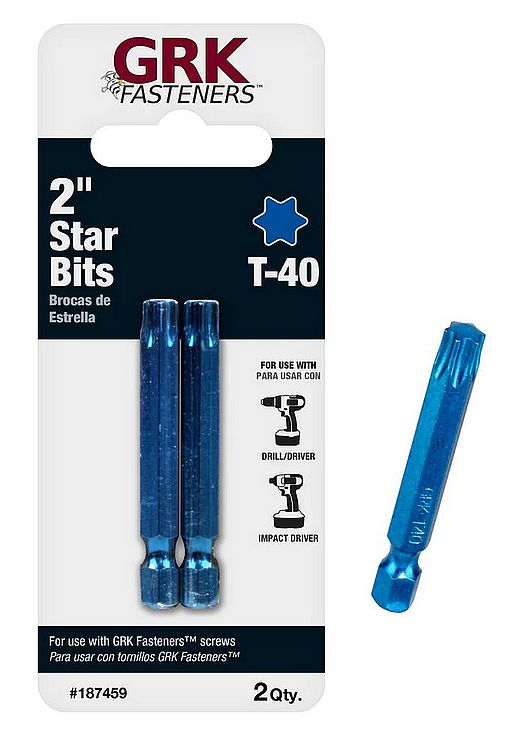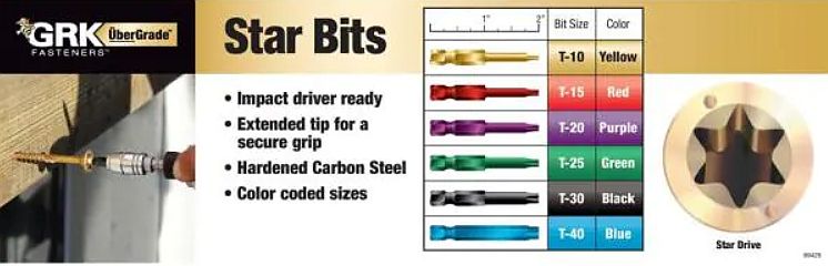 GRK Star Drive Bits provide six points of contact with our star drive head screws. The star drive helps to eliminate stripping for improved productivity.