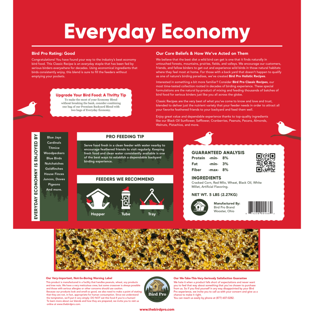 This is Bird Pro 5-Pound Everyday Economy Bird Seed, a straightforward blend designed to attract a wide variety of backyard birds. You’ll want it if you enjoy watching cardinals, titmice, woodpeckers, blue jays, chickadees, nuthatches, grosbeaks, goldfinches, house finches, doves, pigeons and more visit your feeders or yard. The mix combines cracked corn, red milo, wheat, black oil sunflower, and white millet with artifical flavorings for broad appeal, and offers a guaranteed analysis of 8% minimum protein, 3% minimum fat, and 8% maximum fiber. This 5 lb bag is ideal for filling hopper and platform feeders, scattering on the ground for ground-feeding species, or topping off mixed blends to increase variety. It’s an economical choice for everyday feeding that brings frequent feathered visitors to your outdoor space.